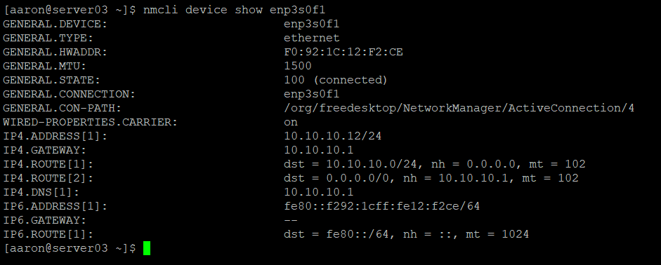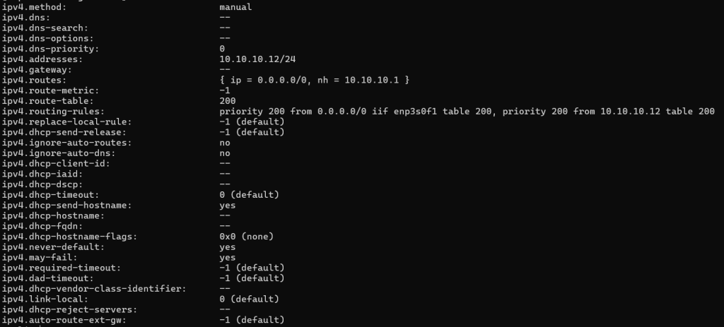 Now I have a static IP of 10.10.10.12 and a default gateway assigned to this interface. I can validate this using nmcli