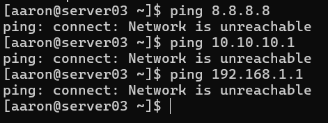 Now I can reach both interfaces! There’s just one problem: I have no route configured on the server that will enable it to create its own outbound connections. When I try to ping anything, even locally-connected network devices, I get a response back that the network is unreachable: