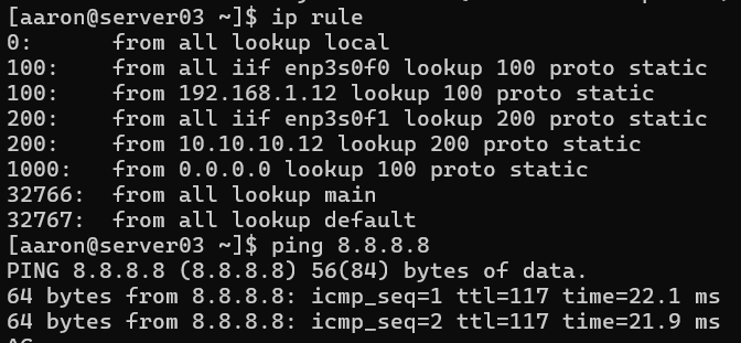 Now I am able to ping out to the Internet – the traffic is leaving from the enp3s0f0 interface.