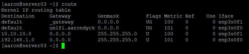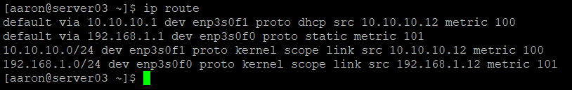I have two networks in this scenario. My main network is 192.168.1.0/24 and the new network is 10.10.10.0/24. The first address in each network is the gateway. Linux created routes for each interface and assigned automatic metrics to them in sequential order.
