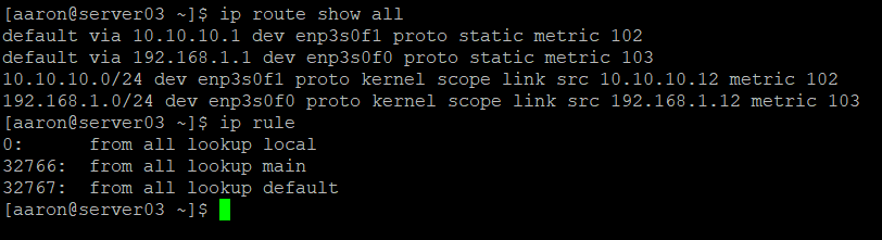 Network Manager uses rules to assign routing tables. There is a default rule list that is built that includes three rules. The rules are evaluated from the lowest number to the highest number. The first rule, Rule 0, will look up rules from the local link table. The remaining two default rules are Rule 32766 which refers to the main table, and Rule 32767 which refers to the default table. Despite the names, the default routes are actually held in the main table. There should be no rules in the default table. You can also see the existing routing table includes a default gateway on each interface and a specific route to each gateway.