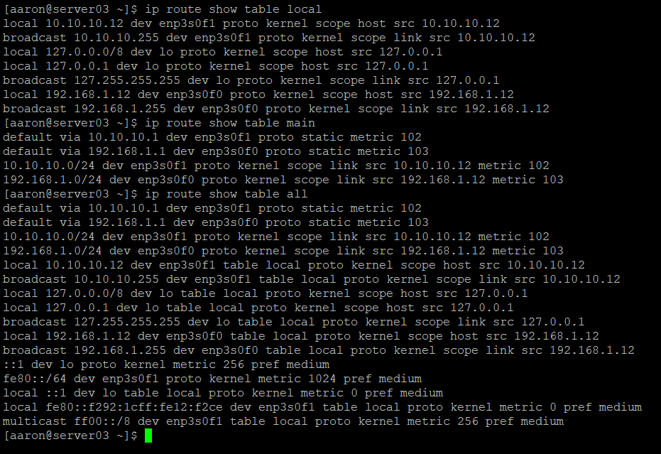 I will define routing tables for each network interface – table 100 on enp3s0f0 and table 200 on enp3s0f1. Once the tables are created, I can populate the tables with rules.