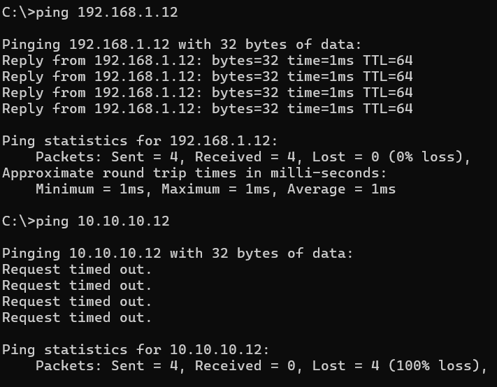 Now that the baseline network configuration has been established, the next step is to look at the routing. With the present configuration, I am unable to reach both interfaces from a device that exists on the same subnet as one of these interfaces.